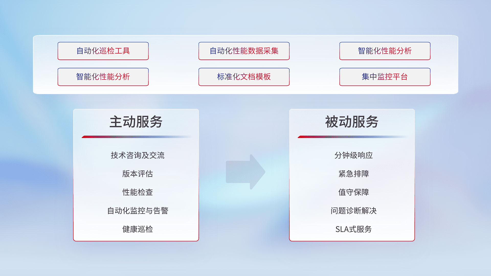 智能化工具和标准化文档,,保障服务质量,,,,提供主动服务(包含技术咨询、、版本评估、、性能检查、、、、自动化监控与告警、、健康巡检)和被动服务包含(分钟级响应、、、、紧急排障、、、值守保障、、、、问题诊断解决、、SLA服务)。。